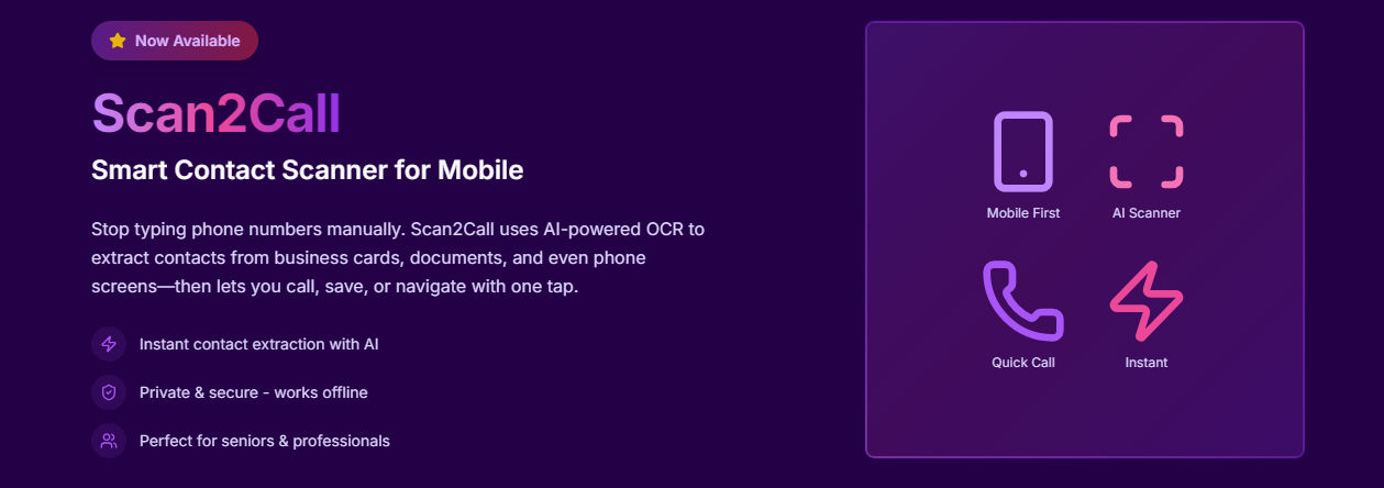 Because the processing happens locally on the user’s phone, Scan2Call delivers reliable performance even in offline scenarios and avoids sending sensitive information to external servers.